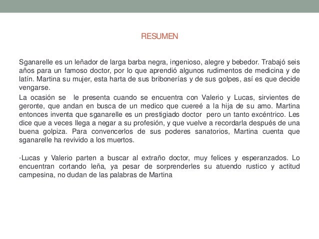 Medico A Palos Resumen. RESUMEN Y ANALISIS de la obra EL MDICO A PALOS deMoliere RESUMEN Bartolo es un leador de larga barba negra alegre y bebedor. Se refiere a La escuela de los maridos.