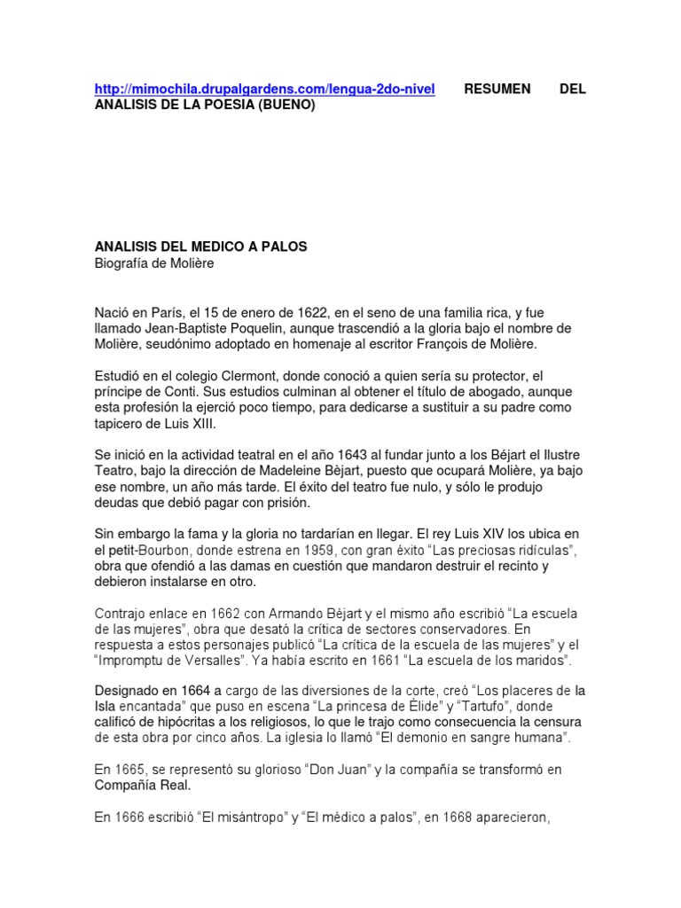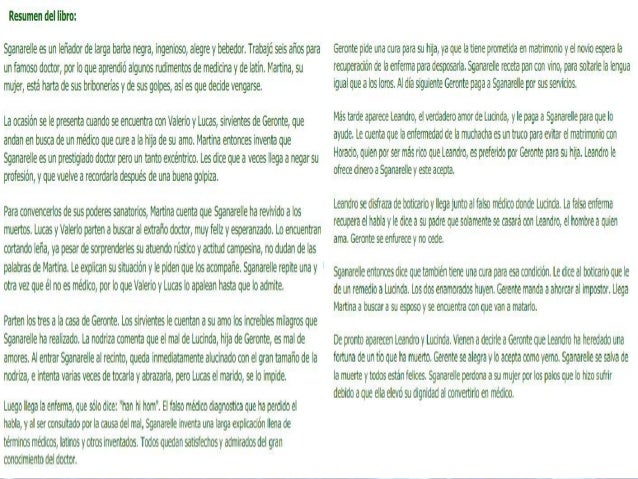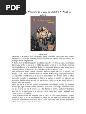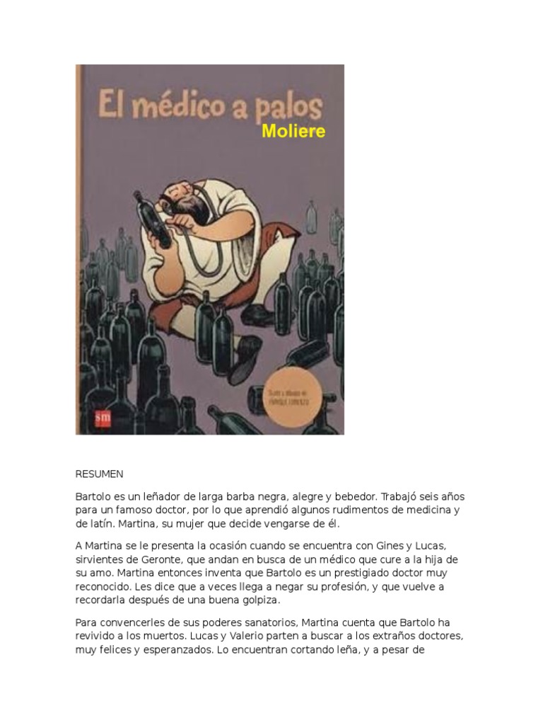 Compartir 0 Me sirvi 1 No me sirvi. Es una historia que funciona como obra burlesca es decir que es una historia graciosa y de carcter caricaturesco. RESUMEN DE LA OBRA LITERARIA EL MEDICO A PALOS - Moliere Argumento de El medico a palos libro de Moliere.
