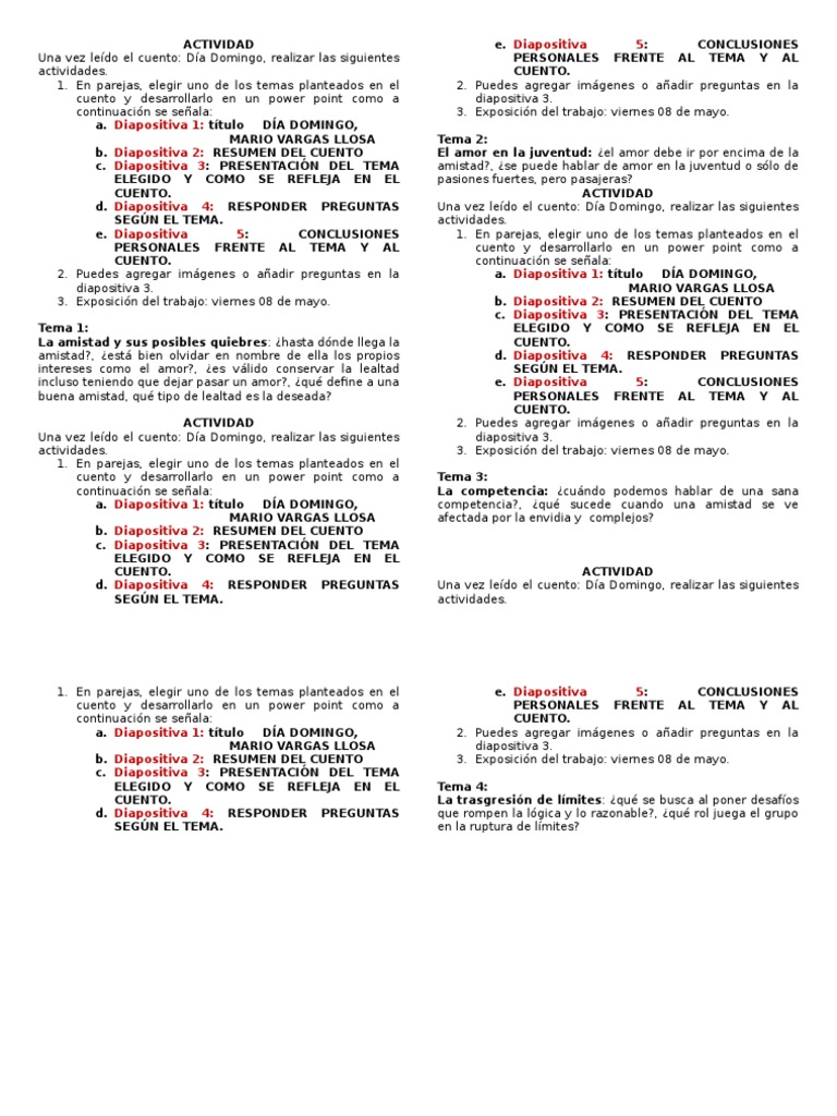 -MARIO VARGAS LLOSA- Resumen del cuento DIA DOMINGO es el siguiente. Da domingo es una narracin llena de nostalgias accin y suspenso empacada en solo treinta pginas. 28 de marzo de 1936 Arequipa Per.