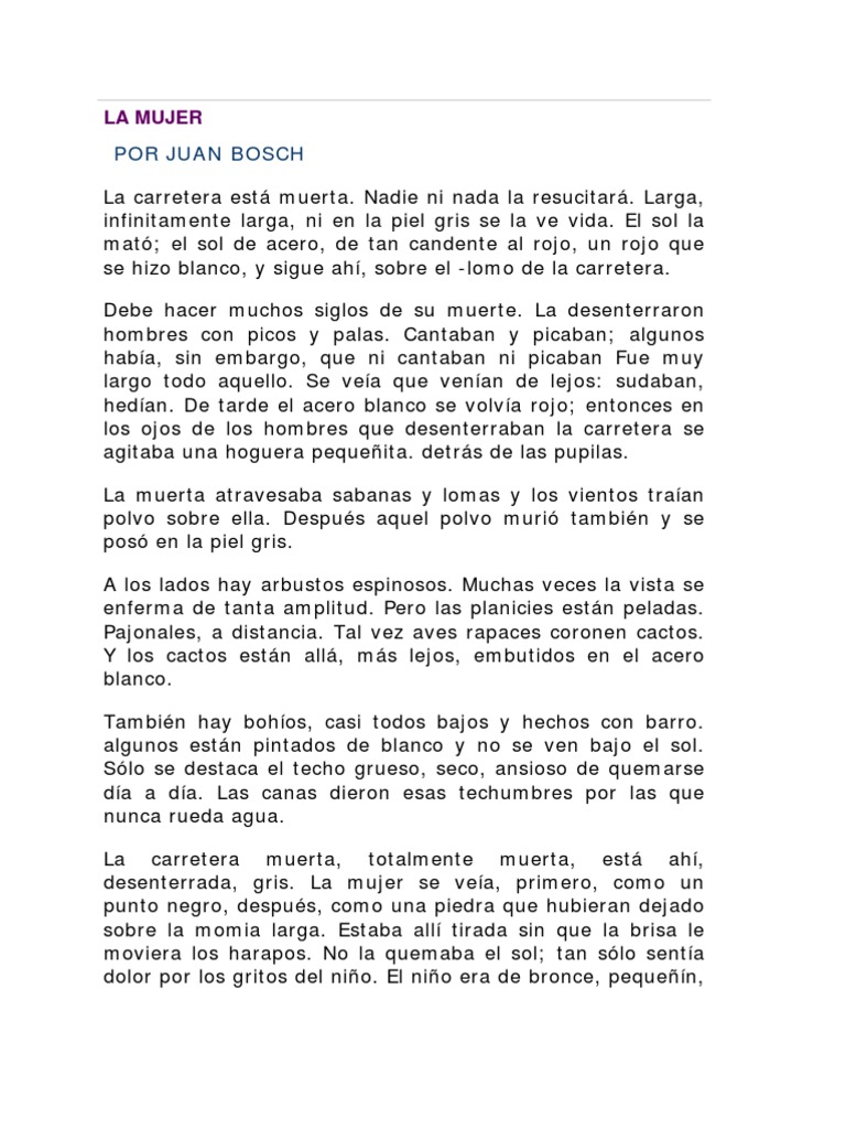 Descripcin de la carretera. Anlisis-resumen del cuento La mujer de Juan Bosch La mujer uno de los cuentos hispanoamericanos ms antologados es una sinfona audiovisual del trpico. Tornose luego transparente el acero blanco y sigue ah sobre el lomo de la carretera.