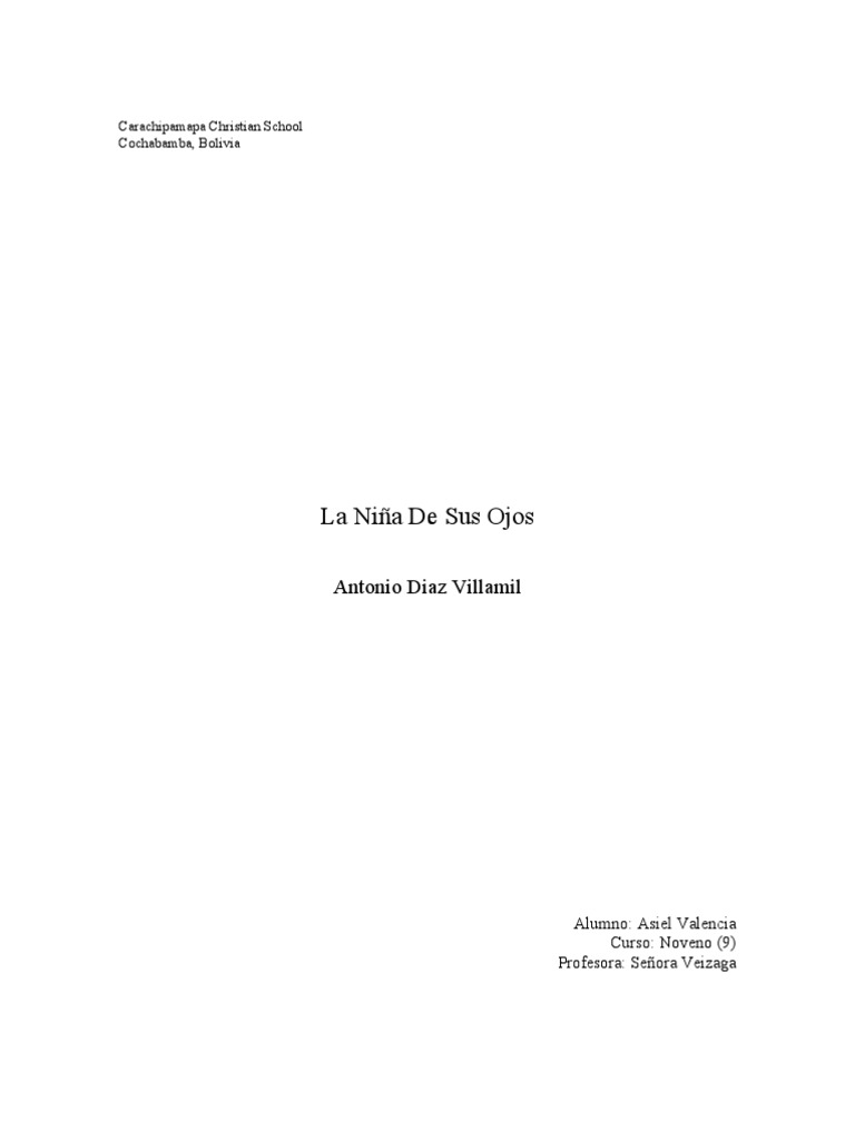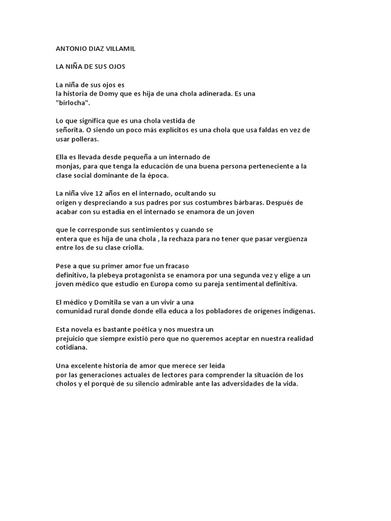 Breve Analisis Literario La Nina De Sus Ojos. Lo que significa que es una chola vestida de seorita. LA NIA DE SUS OJOS La nia de sus ojos escrito por Antonio Daz Villamil a continuacin un resumen breve sobre este libro.