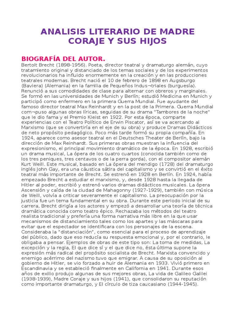 Telephone assistance until 530 pm. A la vivandera Anna Ferling conocida por el nombre de madre Coraje se le va un hijo. 221111 ACTIVIDAD EN BIBLIOTECA Resea Articulo Madre coraje y sus hijos Bertolt Brecht por Benito Ferrucho Bertolt Brecht es a da de hoy proclamado de modo casi unnime como el mayor renovador de la teora y la prctica teatral desde tiempos de Aristteles1.